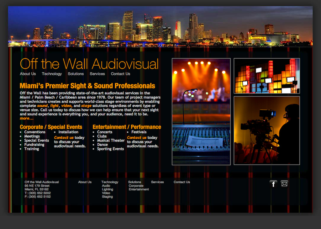 UX/UI, Copywriting, Project Management Redesign of sound and lighting company's site to highlight new product offerings. Company was repositioned as a one-stop shop for entertainment, audio visual and corporate event serving the greater South Florida area. offthewall-av.com